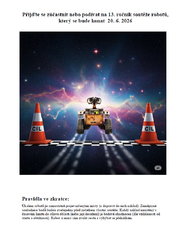 PozvánkaPřijďte se zúčastnit nebo se podívat 13. ročník soutěže robotů 20. 6. 2026 ![]() Pravidla ve zkratce:Úkolem robotů je samostatně projet určenými místy (a dopravit do nich náklad). Zeměpisné souřadnice bodů budou zveřejněny před začátkem vlastní soutěže. Každý náklad umístěný v časovém limitu do cílové oblasti (nebo její dosažení) je bodově ohodnocen (dle vzdálenosti od startu a obtížnosti). Robot si musí sám zvolit cestu a vyhýbat se překážkám. Program:8.30 - 9.30 homologace týmů 9.30 - 10.30 příprava robotů 10.30 start 1. kola 12.30 start 2. kola 15.00 start 3. kola 16.30 vyhlášení výsledků Místo závoduSoutěž bude probíhat v prostoru u Základní školy Úšovice v Mariánských Lázních (GPS 49.95349897N, 12.7095139E). Parkování:Parkování v těsné blízkosti soutěžní dráhy. GPS 49.9534117N, 12.7096769E |